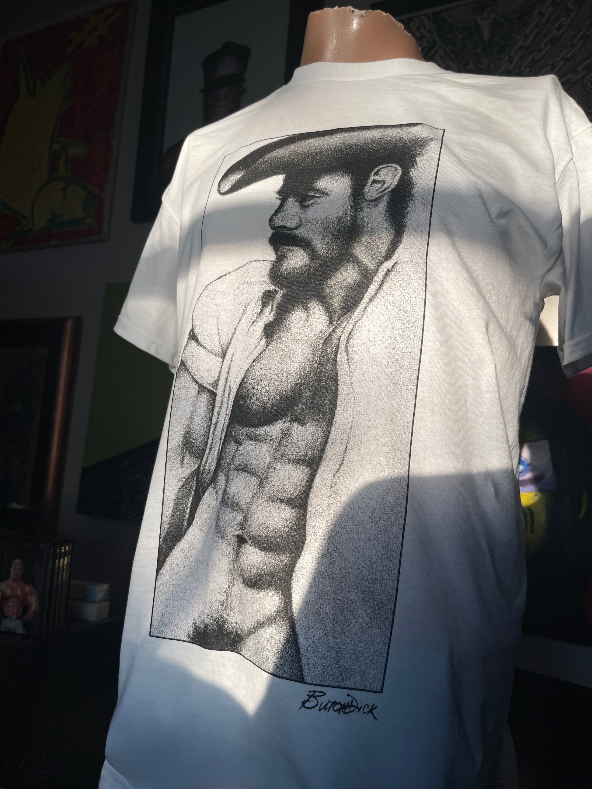 Black ink screen print of my Wrangler drawing on a white 100% heavy cotton Gildan t-shirt!